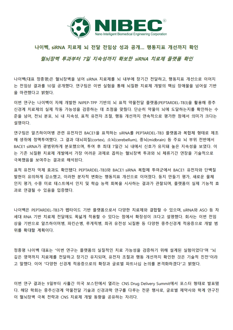 나이벡, siRNA 치료제 뇌 전달 전임상 성과 공개… 행동지표 개선까지 확인