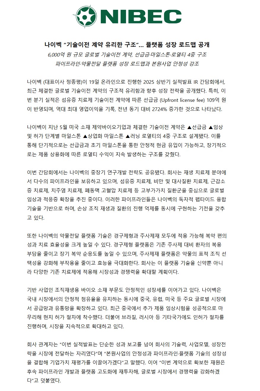 나이벡 “기술이전 계약 유리한 구조”… 플랫폼 성장 로드맵 공개