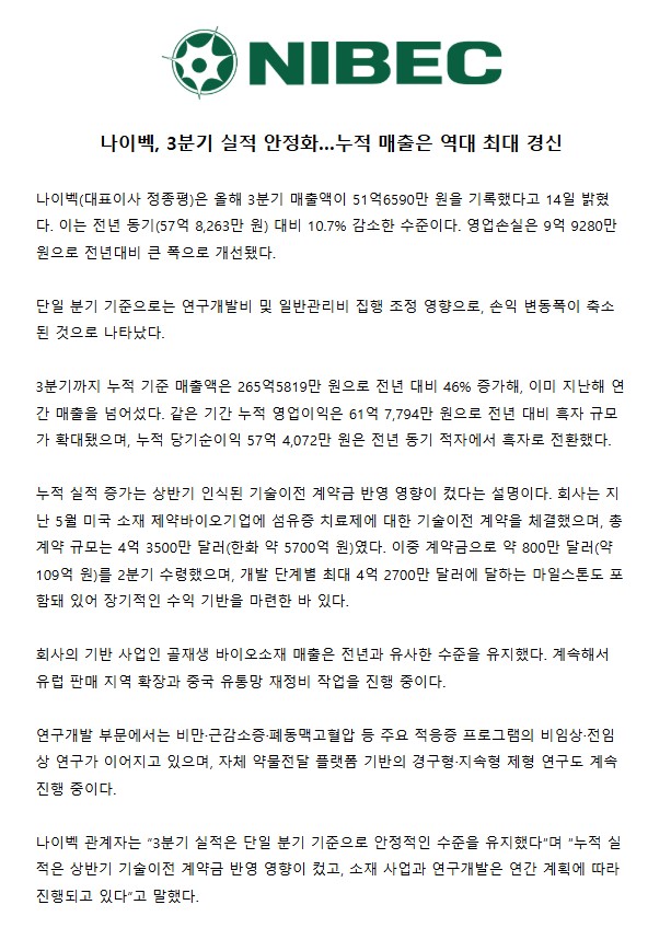 나이벡, 3분기 실적 안정화…누적 매출은 역대 최대 경신